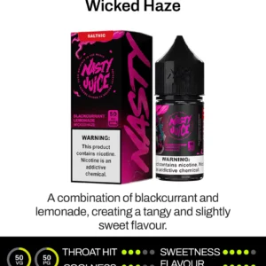 Nasty Juice Blackcurrant Lemonade Wicked Haze, tatlı ve hafif ekşi siyah frenk üzümü ile ferahlatıcı limonata aromasının mükemmel uyumunu sunan premium bir salt likittir. Tatlı meyve lezzetlerinin hafif asidik limonata ile birleşmesi, canlandırıcı ve ferahlatıcı bir içim deneyimi sağlar. Salt nikotin formülü, hızlı nikotin emilimi ve yumuşak boğaz vurumu sunarak sigaraya en yakın hissiyatı yaşatır.